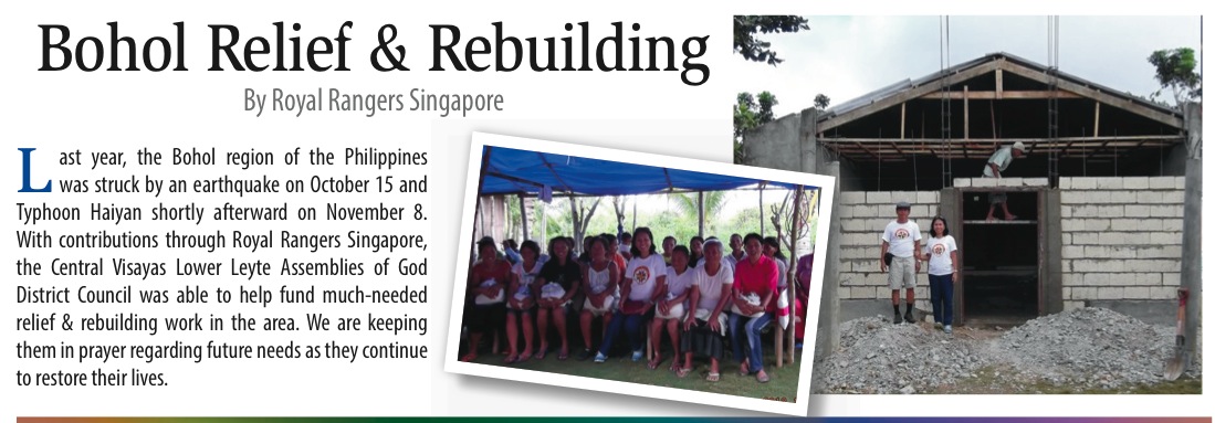 Last year, the Bohol region of the Philippines was struck by an earthquake (Oct. 15, 2013) and Typhoon Haiyan (Nov. 8, 2013) back-to-back. With contributions through Royal Rangers Singapore, the Central Visayas Lower Leyte (CVLL) District Council was able to help fund much needed relief & rebuilding work in the area. We are continuing to keep them in prayer and understand future needs as they continue to restore their lives.